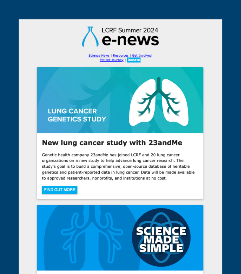 LCRF publishes a quarterly e-newsletter highlighting the latest developments in the lung cancer space and announcing upcoming events. The e-news also features stories from patients and supporters.