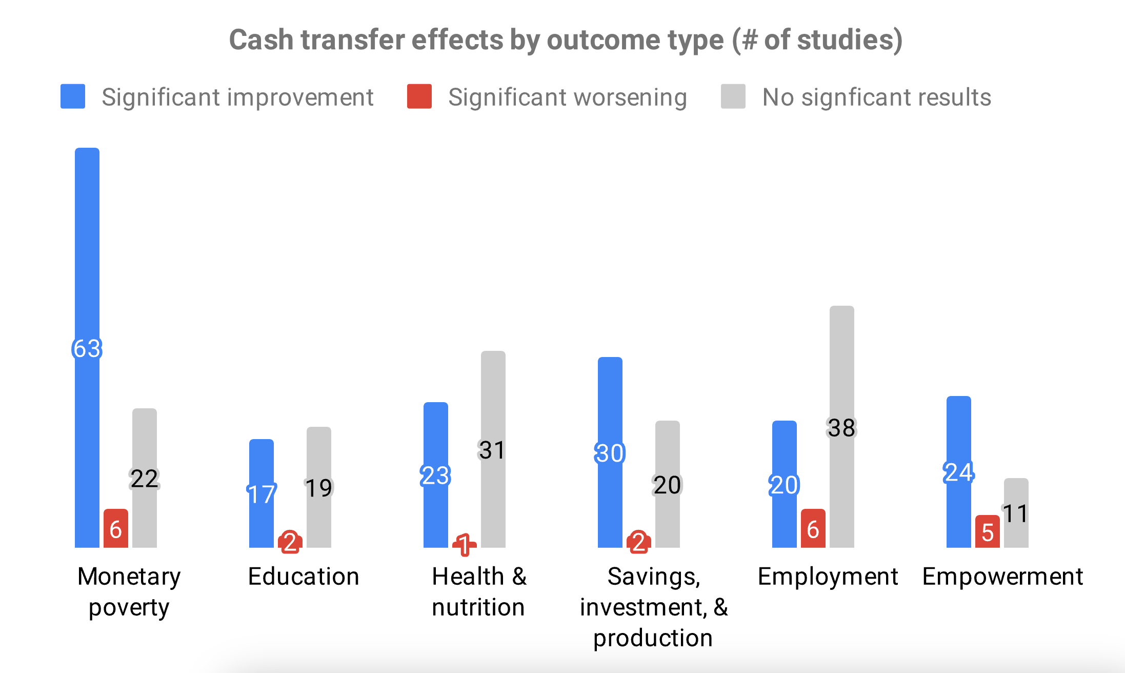 This 2016 literature review of global cash programs found mostly positive impacts (blue bars in the chart below) across a variety of outcomes, especially monetary poverty, savings, and empowerment. But the review also found some studies had null results (gray bars) and a few had negative results (red bars):