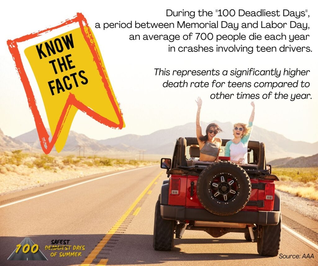 Another summer is upon us and as we make plans for vacations and summer fun, we would like to remind parents and guardians that we are in the “100 Deadliest Days of Summer.” This may be the time to relax and plan for summer fun but IT IS NOT the time to relax while driving, especially for your teens.​ According to NHTSA, nearly half of teen driver-related deaths occur during the 100 Deadliest Days.​ Motor vehicle crashes continue to be the leading cause of preventable death for U.S. teens.