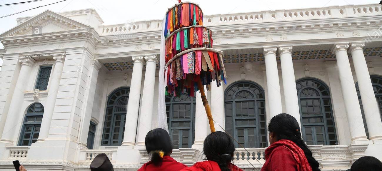 People observe the first festival day by decorating wooden poles and burning them through the night to symbolize the burning of the old year. The erection of a chir (sacred pole) symbolises the tree on which Hindu deity Krishna is said to have hung milkmaids’ clothes while they were bathing in the Jamuna River in India. The women dress in red saris and circle the poles praying for blessings. The custom originated in the Basantapur Durbar Area of Kathmandu, and today the chir is decorated with colorful cloth, reminding the people to prepare for the upcoming celebrations.